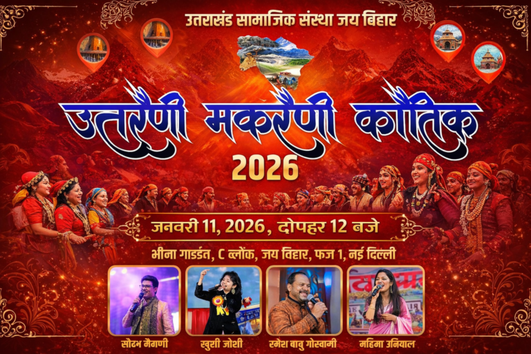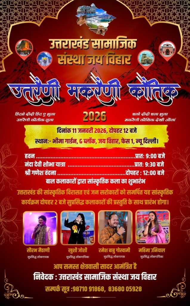 उत्तराखंड की समृद्ध सांस्कृतिक परंपरा और लोकजीवन की झलक प्रस्तुत करने वाला उत्तरैणी–मकरैणी कौतिक 2026 🎶🎭 एक भव्य सांस्कृतिक आयोजन के रूप में आयोजित किया जा रहा है। यह कार्यक्रम उत्तराखंड सामाजिक संस्था जय बिहार 🤝 द्वारा राजधानी नई दिल्ली 🏙️ में उत्तराखंड के लोगों को एकजुट करने और अपनी जड़ों से जोड़ने के उद्देश्य से किया जा रहा है।
