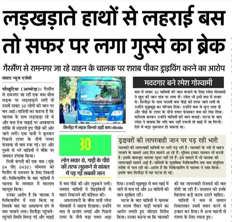 рдЕрд▓реНрдореЛрдбрд╝рд╛ рдЬрд╝рд┐рд▓реЗ рдХреЗ рдЪреМрдмрдЯрд┐рдпрд╛ рдХреНрд╖реЗрддреНрд░ рд╕реЗ рдПрдХ рдЧрдВрднреАрд░ рд▓рд╛рдкрд░рд╡рд╛рд╣реА рдХрд╛ рдорд╛рдорд▓рд╛ рд╕рд╛рдордиреЗ рдЖрдпрд╛ рд╣реИред рдЧреИрд╕реНрд╕реИрдг рд╕реЗ рд░рд╛рдордирдЧрд░ рдЬрд╛ рд░рд╣реА рдПрдХ рдкреНрд░рд╛рдЗрд╡реЗрдЯ рдмрд╕ рдореЗрдВ рдЙрд╕ рд╕рдордп рд╣рдбрд╝рдХрдВрдк рдордЪ рдЧрдпрд╛ рдЬрдм рдпрд╛рддреНрд░рд┐рдпреЛрдВ рдиреЗ рджреЗрдЦрд╛ рдХрд┐ рдмрд╕ рдЪрд╛рд▓рдХ рдирд╢реЗ рдХреА рд╣рд╛рд▓рдд рдореЗрдВ рд╡рд╛рд╣рди рдЪрд▓рд╛ рд░рд╣рд╛ рд╣реИред рдмрд╕ рдореЗрдВ рдХрд░реАрдм 30 рдпрд╛рддреНрд░реА рд╕рд╡рд╛рд░ рдереЗ рдФрд░ рдЪрд╛рд▓рдХ рдХреЗ рд▓рдбрд╝рдЦрдбрд╝рд╛рддреЗ рд╣рд╛рде рд╡ рдЕрд╕рдВрддреБрд▓рд┐рдд рдбреНрд░рд╛рдЗрд╡рд┐рдВрдЧ рджреЗрдЦрдХрд░ рд╕рднреА рдпрд╛рддреНрд░рд┐рдпреЛрдВ рдХреА рд╕рд╛рдБрд╕реЗрдВ рдЕрдЯрдХ рдЧрдИрдВред
